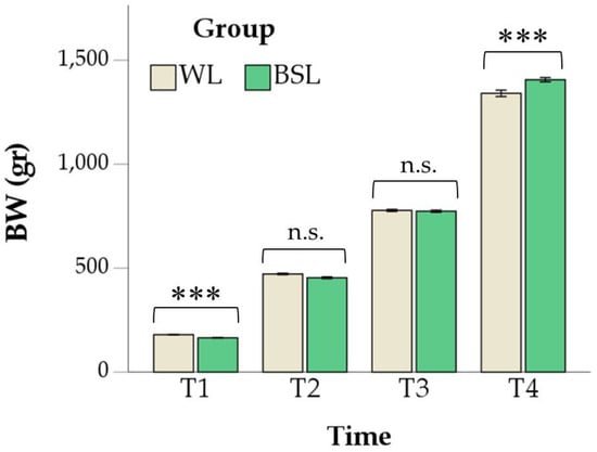 The BW was influenced by time and its interaction with the group (p < 0.001). In particular, the WL group showed higher values at T1 (44 ± 0 vs. 42 ± 0 g, respectively; p < 0.001), while in the last time point, the BW was higher in the BSL group (1341 ± 15 vs. 1407 ± 11 g, respectively; p < 0.001; Figure 2).