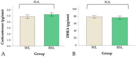 Corticosterone (A) and DHEA (B) in feathers in the white LED (WL) and broiler-specific LED (BSL) groups. Values are means ± standard errors (n.s. = not significant). DHEA = dehydroepiandrosterone.