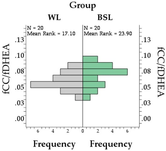 A difference between groups was found for neither fCC concentrations (p = 0.690; Figure 3A), nor for fDHEA (p = 0.080; Figure 3B), nor for the fCC–fDHEA ratio (p = 0.068; Figure 4). The fCC–fDHEA ratio ranged from 0.04 to 0.08 in the WL group (median = 0.06) and from 0.4 to 0.09 in the BSL group (median = 0.07). Additional descriptive data are presented in Supplementary Table S1.