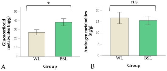 Glucocorticoid (A) and androgen (B) metabolites in droppings in the white LED (WL) and broiler-specific LED (BSL) groups. Values are means ± standard errors. The asterisk indicates significant differences between the two groups (* p < 0.05; n.s. = not significant).