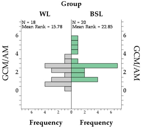 In droppings, the GCMs concentration was higher in the BSL group (38.4 ± 4.0 ng/g) than in the WL group (26.9 ± 3.1 ng/g; p = 0.031; Figure 5A), while no difference between groups was found in AM concentrations (p = 0.719; Figure 5B and Supplementary Table S1). Finally, the slight difference in the GCMs–AMs ratio (Figure 6 and Supplementary Table S1) did not reach statistical significance (p = 0.051), ranging from 0.3 to 3.95 in the WL group (median = 2.1) and from 1.4 to 5.8 in the BSL group (median = 2.7).