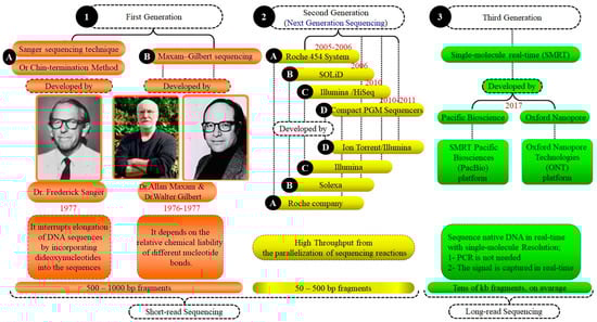 There are three generations of sequence systems (GSS). (1) The first generation, including the Sanger sequencing technique (Chin-termination method) and Maxam–Gilbert sequencing, started in the 1970s. (2) The second generation (NGS). (3) The third generation (single-molecule real-time SMRT) (Figure 3). The evolution of genetic tools/approaches through the last few decades is shown in (Figure 2 and Figure 3).