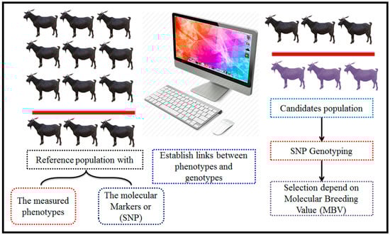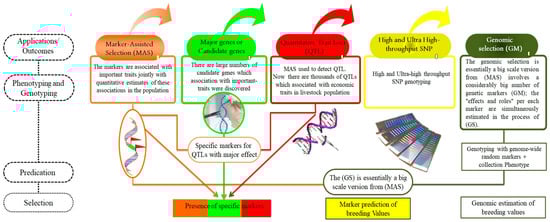 One of the most important outcomes of utilizing molecular tools is to identify the markers used in animal selection. In general, molecular markers (MM) are fragments of DNA that are associated with certain locations within the genome. They are utilized to identify a particular DNA sequence in a pool of unknown DNA [113,114]. The marker-assisted selection (MAS), also known as marker-aided selection, is an indirect selection process where a target trait is selected based on a marker (DNA/RNA, biochemical, or morphological variation) linked to a target trait (e.g., productivity, reproduction, stress tolerance, disease resistance, etc.) (Figure 4). The concept of MAS was originally found as early, using both genotypic and phenotypic information. In addition to the preceding applications, MAS provides a definitive test of ancestry [138] and ensures that a given breed or individual carries a particularly rare or useful gene included in the conservation program [139]. Utilization of MAS depends on the relationship between the quantitative traits and MM (Figure 4). It helps to conquer the restrictions of traditional selection and can be utilized on sex-limited and low-heritable traits, and those measured later, towards the end of an animal’s life. MAS increases the genetic gain by reducing the generation interval but requires information on alleles or markers associated with the target traits jointly with quantitative estimates of these associations prior to application for a specific animal population [140].