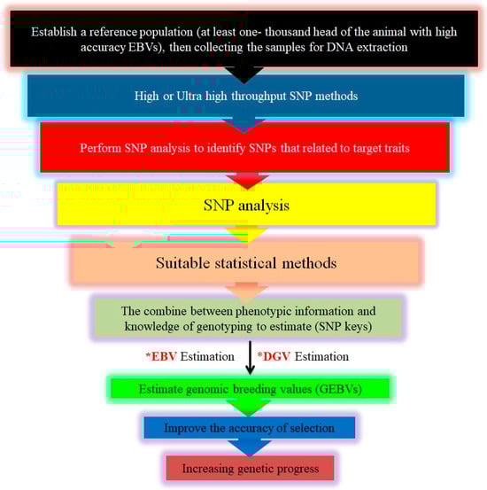 Steps in implementing genomic selection (GS). This Figure outlines the comprehensive process for implementing genomic selection in livestock breeding. It begins with the collection of phenotypic and genotypic data from a reference population utilizing high-throughput SNP genotyping technologies. Next, the effects of individual SNPs on various traits are estimated using advanced statistical models. These effects are used to calculate direct genomic values (*DGV), which represent each individual’s genetic potential based solely on their genomic information. The DGV are then integrated with traditional estimated breeding values (*EBVs) to produce genomic-estimated breeding values (GEBV), offering a more accurate prediction of an individual’s breeding potential by combining genomic data with pedigree information. Superior individuals, identified through their GEBV, are selected as breeding candidates, allowing more efficient improvement of desired traits. Finally, these selected individuals are used in breeding programs to enhance trait optimization and accelerate genetic gain across the livestock populations.