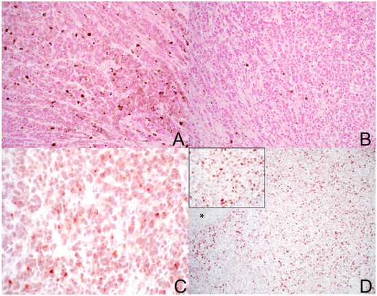 (A,B) Histological appearance of canine malignant anorectal melanoma. Neoplastic melanocytes are arranged in bundles and sheets. Neoplastic cells with cytoplasmic pigment are more abundant in some areas of the tumour tissue (A) while they are scattered in other areas (B). (A,B): 200×, bar: 200 µm; haematoxylin and eosin (H&E). (C,D) Immunohistochemical staining of canine malignant anorectal melanoma showed neoplastic cells with focal Melan-A immunoreactivity (C) and widespread nuclear immunoreactivity for Ki67 ((D), inset). * Indicates an area of necrosis. (C): 400×, bar: 100 µm; (D): 100×, bar: 400 µm; inset 400×, bar: 200 µm; Novared chromogen and haematoxylin counterstain.
