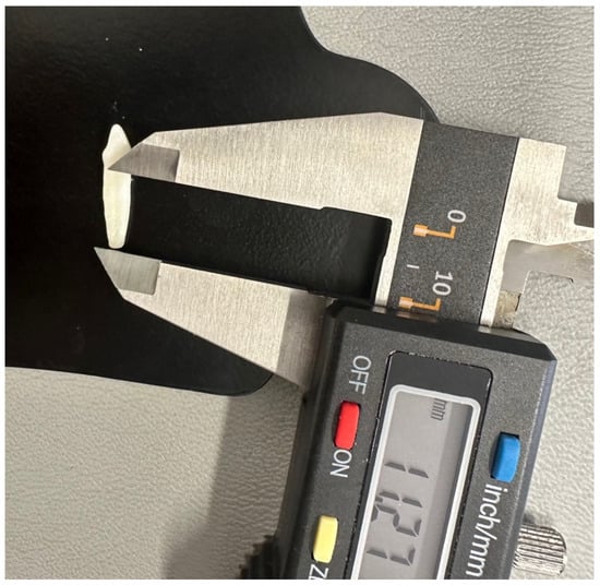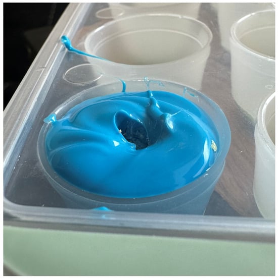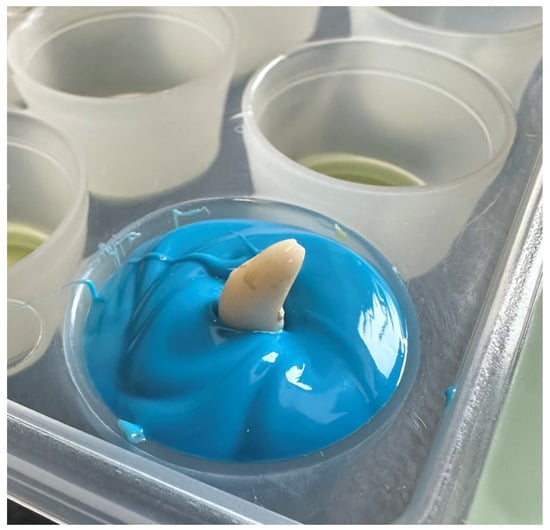 The layers of silicone were mixed according to the manufacturer’s recommendations using a dedicated mixing tip. Using an impression mass gun, the cavities in the medical tray, which had previously been ascribed to a specific weight group and tooth structure, were filled with silicone (Figure 3). After waiting the time recommended by the manufacturer (2 min 30 s), the teeth were immersed up to the height of the dental neck. After the polymerisation of the material within the time recommended by the manufacturer (3 min 30 s), the teeth were removed from the silicone mass, and an accurate impression of the alveolus was obtained. Then, using automatic pipettes with an accuracy of 20–100 µL, a volume of fluid was measured to fill the imprint to the line representing the transition between the root and the tooth crown (Figure 4). The root volumes of individual teeth were determined in this manner. The volume data and tooth lengths are included in Table 1.