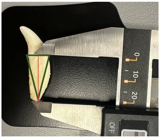 A digital calliper with an accuracy of 0.01 mm was used to measure the length of the tooth root (Kormax 150 mm, SKC150, Manufacturer Kormax, Warsaw, Poland). When measuring the first and second incisors, the distance between the tooth neck and the apex of the root was determined as the tooth length (Figure 1). To measure the length of teeth with curvature (third incisor and fang), the bisector of the angle with its origin at the apex of the root and its end at the base of the triangle was determined, with a line drawn through the cervical part of the tooth (Figure 2).