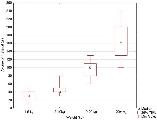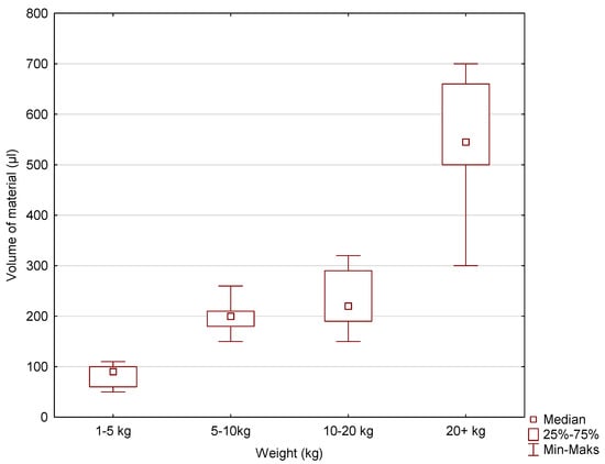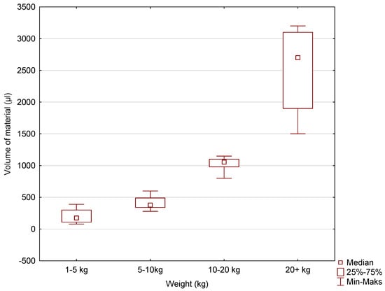 Box-and-whisker plots were used to graphically represent the median, quartiles, and the minimum and maximum values of the data. The median (Me) alveolar volumes (μL) for incisors I and II in dogs in the 1–5 kg, 5–10 kg, 10–20 kg, and over 20 kg weight categories were 30, 40, 100, and 160, respectively. The Me values for maxillary incisor III were 90, 200, 220, and 545. The Me values for the canine were 175, 380, 1055, and 2700. The largest range of volume values was recorded for incisors I and II, maxillary incisor III, and the canines in the over 20 kg weight category (Figure 5, Figure 6 and Figure 7).