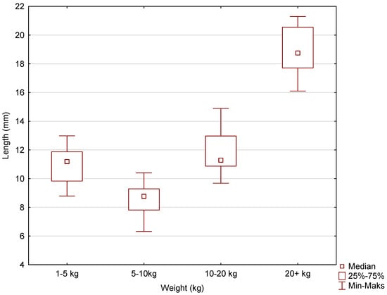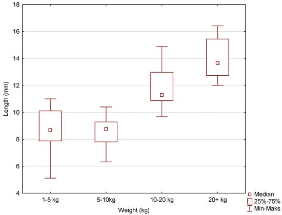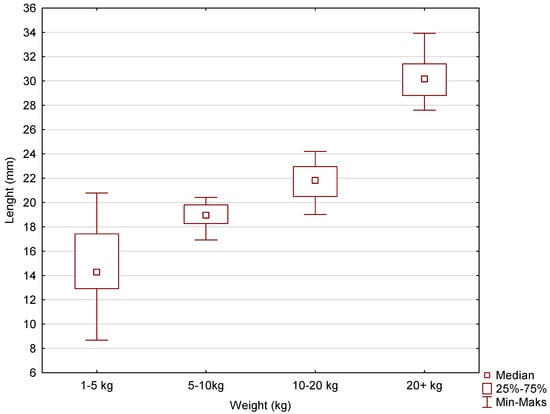 The average root lengths of maxillary incisors I and II were 8.65 ± 1.59, 8.53 ± 1.01, 11.85 ± 1.40, and 14.06 ± 1.41, respectively, for dogs in the following weight ranges: less than 5 kg, 5–10 kg, 10–20 kg, and more than 20 kg. The mean root lengths of maxillary incisor III were, respectively, 10.87 ± 1.22, 11.05 ± 0.59, 13.91 ± 1.74, and 18.90 ± 1.56. The mean canine root lengths were 14.90 ± 3.35, 19.02 ± 0.85, 21.64 ± 1.51, and 30.09 ± 1.56 for the patients in the weight range studied, i.e., less than 5 kg, 5–10 kg, 10–20 kg, and more than 20 kg. Box-and-whisker plots were used to graphically represent the median, quartiles, and minimum and maximum values of the data. The median (Me) lengths (mm) of the animals’ teeth for incisors I and II in the weight categories 1–5 kg, 5–10 kg, 10–20 kg, and 20+ kg were, respectively, 8.68, 8.77, 11.29, and 13.66. The Me values for incisor III were 11.19, 11.03, 14.00, and 18.76. The Me values for the canines were 14.27, 18.95, 21.82, and 30.16 (Figure 8, Figure 9 and Figure 10). The largest differences in the spread of tooth root length data were recorded for incisors I and II in the 1–5 kg weight group and, for incisor II, in the 10–20 kg weight group and also the canines in the 1–5 kg weight group.