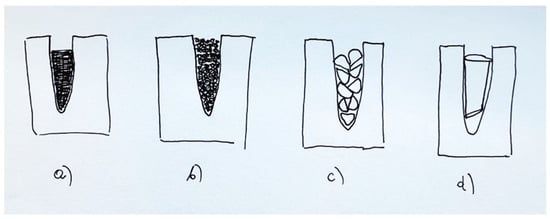 A schematic diagram showing the filling of alveoli with a bone substitute material (a) in the form of a cylindrical pellet after plasticity has been achieved (FlexiOssVet®), (b) in the form of granules (Adbone®, SinossGraft®), (c) in the form of cylindrical pellets (PerOssal®), and (d) in the form of a block/cylinder (Adbone®).
