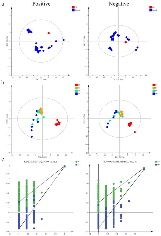 Quality control (QC) and partial least squares discriminant analysis (PLS-DA) of metabolomic data from goose breast meat samples. (a) Principal component analysis (PCA) of QC samples in the positive and negative ion modes. The abscissa represents the first principal component, and the ordinate represents the second principal component. (b) PLS-DA models based on the normalized metabolomics data under the positive and negative ion modes. Each point in the graph represents one sample, and samples from the same group are shown in the same color. The distance between each point indicates the difference between the metabolites in the sample. (c) Permutation plot used to verify the PLS-DA model under positive and negative ion modes. The two dashed lines represent the regression lines of R2 and Q2 respectively. Abbreviations: D0, refrigerated storage for 0 days; D3, refrigerated storage for 3 days; D6, refrigerated storage for 6 days; D9, refrigerated storage for 9 days.