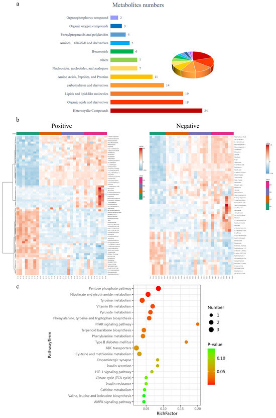 The PLS-DA model was used to determine the variations in metabolite abundance within the geese samples. Significant differences between groups were determined using the criteria described above. The differential metabolites in positive and negative ion modes were designated for 121 of the 1226 metabolites. These metabolites belonged to various classes, including heterocyclic compounds (19.83%), organic acids and derivatives (15.7%), lipids and lipid-like molecules (15.7%), carbohydrates and derivatives (11.57%), amino acids, peptides, and proteins (9.10%), nucleosides, nucleotides, and analogs (5.79%), others (5.79%), benzenoids (4.96%), amines, alkaloids, and derivatives (4.13%), phenylpropanoids and polyketides (3.31%), organic oxygen compounds (2.48%), and organophosphorus compounds (1.65%) (Figure 2a).
