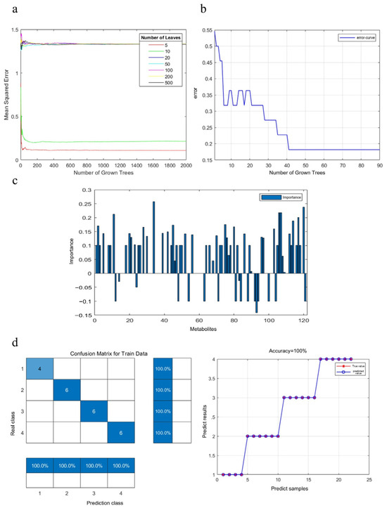 Potential metabolite biomarkers in goose breast meat, identified by random forest regression. (a) Cumulative error rates in the random forest classification. (b) The mean square error analysis was based on the number of trees and leaves. (c) Listing of metabolic biomarkers in order of importance. (d) Confusion matrix and prediction accuracy of train set data.