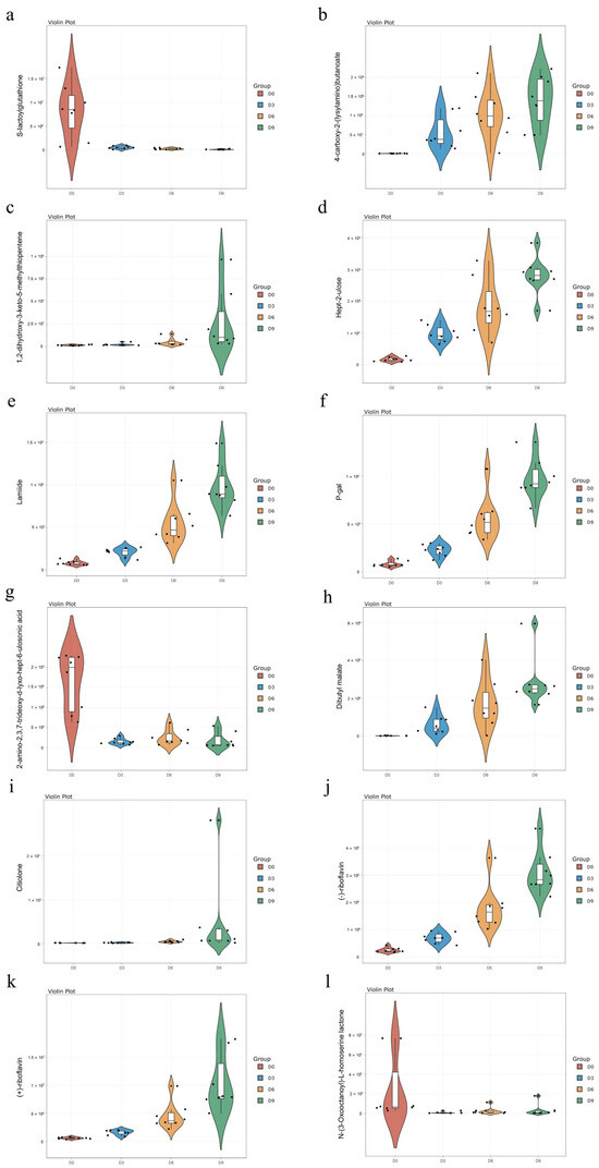 Violin plots of 12 metabolites identified in goose breast meat over storage using the random forest model and time series analysis. The group division is indicated on the x-axis of violin plots. The y-axis of violin plots represents the relative abundance of metabolites. The metabolites depicted in (a–l) are as follows: S-lactoylglutathione; 4-carboxy-2-(L-lysylamino)butanoate; 1,2-dihydroxy-3-keto-5-methylthiopentene; Hept-2-ulose; Lamiide; P-gal; 2-amino- 2,3,7-trideoxy-d-lyxo-hept-6-ulosonic acid; Dibutyl malate; Citiolone; (-)-riboflavin; (+)-riboflavin; N-(3-Oxooctanoyl)-L-homoserine lactone.
