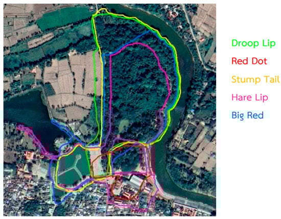 Kosumpee Forest Park study site and the estimated home range of each group of macaques. (Adapted from Kyes, et al., 2018 [10]).