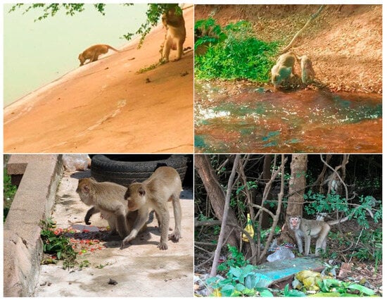 - Kyes, R.C.; Tanee, T.; Thamsenanupap, P.; Karaket, A.; Iskandar, E.; Kyes, P. Population status of the long-tailed macaques (Macaca fascicularis) at Kosumpee Forest Park, Maha Sarakham, Thailand. Am. J. Primatol. 2018, 80, 22. [Google Scholar]
