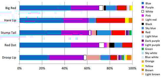 The MPs found in the macaques’ feces consisted of 18 distinct colors, as shown in Figure 4. This is likely to reflect a range of contamination sources, with the wastewater treatment ponds located near the forest park being a primary contributor. These ponds receive effluent from surrounding communities, where household activities such as laundry contribute microplastic fibers, particularly polyester, into the water system [18,19,20,21,22,23]. The most frequently detected microplastic color was blue, comprising 38.48% of the total MPs and present across all the macaque groups. Purple followed at 25.82%, while light brown was the least common at 0.25%.