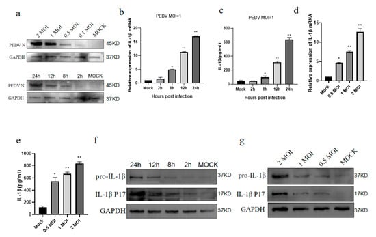 IL-1β is an inflammation-related cytokine that also has key roles in cell proliferation, differentiation, and apoptosis [,]. PEDV infection increases the expression of pro-inflammatory cytokines and chemokines in in vitro experiments, and pro-inflammatory cytokines, such as IL-1β, inhibit PEDV replication in vitro [,]. Therefore, we first assessed the IL-1β expression levels in IPEC-J2 cells after PEDV infection. The Western blot analysis was conducted on IPEC-J2 cells infected with PEDV for 24 h. The results demonstrated that the N protein of PEDV increased in a dose-dependent manner. Furthermore, the level of the N protein in IPEC-J2 cells rose with the extension of the infection duration. These findings suggest that PEDV replicates efficiently in IPEC-J2 cells (Figure 1a). The real-time quantitative PCR analysis demonstrated that the IL-1β mRNA expression levels showed an upward trend 8 h after the infection of the IPEC-J2 cells with PEDV and reached a peak at 24 h (Figure 1b). Further, the ELISA of the cell supernatants revealed that the IL-1β secretion from PEDV-infected IPEC-J2 cells also showed a comparable upward trend (Figure 1c). In addition, infection with different doses of PEDV led to a dose-dependent increasing trend in IL-1β mRNA expression (Figure 1d), while the IL-1β secretion in the cell supernatants also increased in a dose-dependent manner, according to the ELISA results (Figure 1e). The Western blot analysis demonstrated an increasing trend in the IL-1β protein levels with an increasing PEDV exposure time and dose. During this period, the mature IL-1β P17 protein also showed the same increasing trend (Figure 1f,g). Taken together, these results indicate that the PEDV infection of IPEC-J2 cells promotes IL-1β expression and secretion.