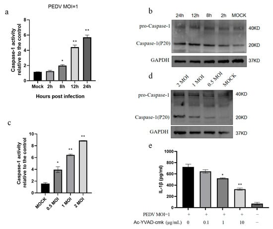 PEDV promotes caspase-1 enzymatic activity in IPEC-J2 cells. Caspase-1 enzyme activity (a) and Western blot results (b) at the specified time points after the PEDV infection of IPEC-J2 cells (MOI = 1). Caspase-1 enzyme activity (c) and Western blot results (d) of IPEC-J2 cells infected with PEDV at the specified doses for 24 h. IPEC-J2 cells were treated with the caspase-1 inhibitor, Ac-YVAD-cmk, at the specified concentration for 1 h and then inoculated with PEDV (MOI = 1). ELISA was used to detect IL-1β secretion in the cell supernatant 24 h after infection (e). Data represent the mean ± SD (n = 3). * p < 0.05, ** p < 0.01.