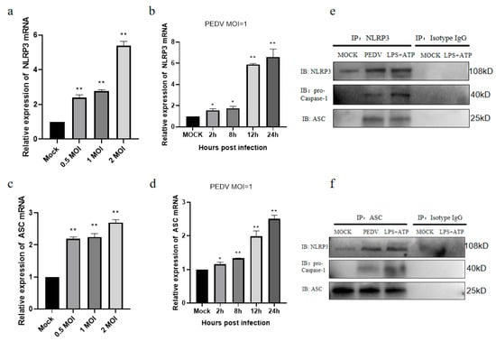 Our findings demonstrate that the PEDV infection of IPEC-J2 cells promotes the secretion of mature IL-1β. Previous studies have shown that RNA viruses can induce mature IL-1β secretion by activating the NLRP3 inflammasome pathway at different stages of infection [,,]. To determine whether the NLRP3 inflammasome is activated after PEDV infection, we detected its expression and found that the NLRP3 inflammasome mRNA expression increased in a time- and dose-dependent manner following the infection of IPEC-J2 cells with PEDV (Figure 3a,b), demonstrating that the PEDV infection of IPEC-J2 cells promoted NLRP3 mRNA expression. Further, the ASC mRNA expression was also upregulated after the PEDV infection of IPEC-J2 cells (Figure 3c,d). Next, a co-immunoprecipitation experiment using A/G magnetic beads was conducted, with the NLRP3 and ASC antibodies as bait and primary antibody homologous serum as a negative control. The results showed that IPEC-J2 cells infected with PEDV and cells in the LPS+ATP induction group contained NLRP3 assembled in inflammasomes with ASC and pro-caspase-1 (Figure 3e,f). In summary, the NLRP3 inflammasome was activated in PEDV-infected IPEC-J2 cells.