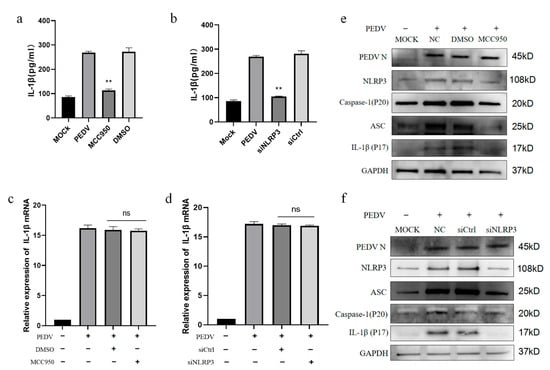 Next, we determined whether IL-1β production induced by the PEDV infection of IPEC-J2 cells was related to NLRP3 inflammasome activation. Cells were treated with the NLRP3 inhibitor MCC950 and the amount of IL-1β secreted in the cell supernatants was detected after PEDV infection. The results showed that, after NLRP3 inflammasome inhibition, IL-1β secretion in the cell supernatants was significantly decreased (Figure 4a). In addition, siRNA transfection was used to silence the NLRP3 inflammasome mRNA, which also resulted in significantly reduced IL-1β secretion in the cell supernatant (Figure 4b); however, neither MCC950 nor siNLRP3 significantly influenced IL-1β mRNA transcription in IPEC-J2 cells (Figure 4c,d). Nevertheless, the Western blot analysis of the inflammasome protein components showed that treatment with MCC950 and SiNLRP3 inhibited the expression of ASC, caspase-1, and the IL-1β p17 protein in the cells (Figure 4e,f). Together, these results indicate that PEDV-infected IPEC-J2 cells induce IL-1β secretion by activating the NLRP3 inflammasome.
