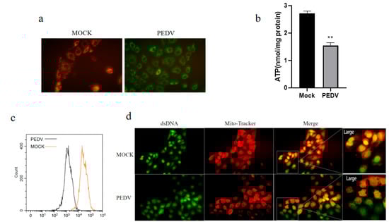 Mitochondria participate in a wide range of innate immune pathways, and there is increasing evidence supporting a role for mitochondria in promoting innate immune activation after cell injury and stress through ROS production [,], where mtROS can accelerate the activation of the NLRP3 inflammasome []. In addition, various physiological or pathological stressors can also trigger mtDNA release into the cytoplasm, thereby activating the NLRP3 inflammasome [,]. To clarify the role of mitochondria in mediating inflammasome activity in PEDV-infected IPEC-J2 cells, we studied the mitochondrial function of IPCJ2 cells during PEDV infection. The mitochondrial membrane potential was detected by JC-1 fluorescent molecule staining after PEDV infection. We observed that PEDV infection reduced the mitochondrial membrane potential (Figure 5a). In addition, PEDV infection significantly reduced the ATP production by IPEC-J2 cells (Figure 5b). These findings show that PEDV infection causes mitochondrial dysfunction. Next, we used MitoROS probes to selectively target mitochondria in living cells; MitoROS probes are rapidly oxidized by superoxide and cannot be oxidized by other ROS or reactive nitrogen species. Oxidation products emit strong fluorescence in cells; therefore, we stained the ROS produced by the mitochondria after PEDV infection and analyzed them through flow cytometry. The results showed that PEDV infection caused mtROS accumulation in the cells (Figure 5c). In addition, we stained IPEC-J2 cells infected with PEDV with Mitotracker (red, mitochondrial indicator) and Picogreen (green, mitochondrial DNA and nuclear DNA indicator). Subsequent immunofluorescence microscopy observation demonstrated that mtDNA and mitochondria were increased in non-overlapping staining areas after PEDV infection, indicating that part of the mtDNA was released outside of the mitochondria (Figure 5d). These data indicate that the PEDV infection of IPEC-J2 cells can lead to mitochondrial dysfunction, the accumulation of mtROS, and the release of mtDNA.