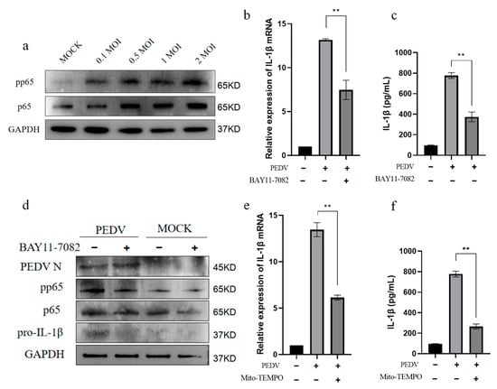 NF-κB is a nuclear transcription factor with an important role in the regulation of inflammatory responses. PEDV can activate NF-κB through the TLR2, TLR3, and TLR9 pathways [], and some studies have confirmed that ROS can also activate the NF-κB pathway to regulate IL-1β mRNA transcription [,]. Our data demonstrate that mitochondrial stress can lead to mtROS accumulation in the cytoplasm after the PEDV infection of IPEC-J2 cells. Based on this finding, we speculated that mtROS production after PEDV infection may be involved in NF-κB activation. To test this hypothesis, we explored the role of mtROS in inducing IL-1β production in IPEC-J2 cells infected with PEDV. Western blot experiments showed that P65 and pp65 were upregulated in a dose-dependent manner after PEDV infection (Figure 6a), indicating that NF-κB was activated. Further, the NF-κB inhibitor, BAY11-7082, significantly inhibited PEDV infection-mediated IL-1β mRNA expression and protein secretion (Figure 6b,c). Furthermore, Western blotting showed that BAY11-7082 alleviated pp65 phosphorylation and reduced pro-IL-1β protein expression (Figure 6d). Treating IPEC-J2 cells with the mitochondrial superoxide-targeted inhibitor Mito-TEMPO significantly inhibited IL-1β mRNA production mediated by the PEDV infection of IPEC-J2 cells (Figure 6e,f). These results indicate that mtROS are involved in NF-κB signaling activation after the PEDV infection of IPEC-J2 cells.