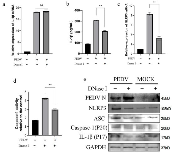 Oxidative stress in mitochondria is an important reason for mtDNA release []. Further, mtDNA is a recognized DAMP, and mitochondrial oxidative stress can cause mtDNA to translocate into the cytoplasm and activate the NLRP3 inflammasome [,]. To determine whether the mtDNA produced by mitochondrial stress oxidation after the PEDV infection of IPEC-J2 cells is involved in the NLRP3 inflammasome activation process, we next inhibited mtDNA synthesis using DNase I and observed the NLRP3 activation after PEDV infection. The results showed that IL-1β mRNA transcription was not affected by DNase I transfection (Figure 7a); however, it significantly inhibited IL-1β secretion into the cell supernatant (Figure 7b). In addition, after DNase I transfection, the NLRP3 inflammasome mRNA expression was reduced in the cells (Figure 7c), while the caspase-1 enzyme activity decreased (Figure 7d). The Western blot analysis also showed that the protein expression levels of NLRP3, ASC, caspase-1, and IL-1β were inhibited after DNase I transfection (Figure 7e). These results indicate that mtDNA activates the NLRP3 inflammasome in PEDV-infected IPEC-J2 cells.