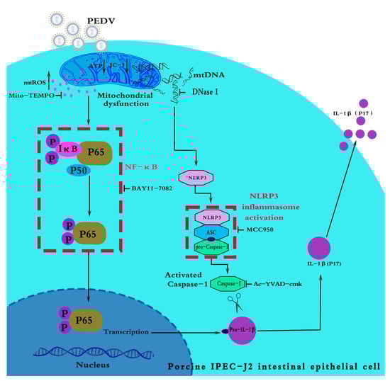 In conclusion, we observed that the PEDV infection of IPEC-J2 cells caused mitochondrial dysfunction, mtROS production, and mtDNA release, to activate the NF-κB signaling pathway and NLRP3 inflammasome, thereby inducing IL-1β production. We report, for the first time, that the NLRP3 inflammasome is activated after the PEDV infection of IPEC-J2 cells, mediating IL-1β secretion. Our data also indicate that mitochondria are critical in PEDV-triggered inflammatory responses (Figure 8). The results of this research enrich our understanding of the inflammatory mechanisms occurring during PEDV infection and provide new ideas to inform the development of anti-PEDV-targeted drugs.