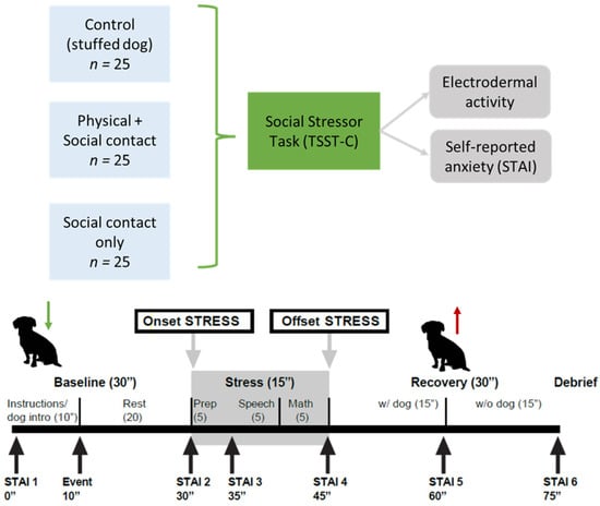 In the control condition (1), participants listened to the verbal presentation but there was no animal present. Instead, there was a stuffed toy dog to serve as active control [] and a person (to mirror the therapy dog handler). In both animal interaction conditions, one therapy dog and their handler accompanied the participant during all phases of the TSST-C. In the social interaction condition (2), participants were told that the dog would be present, and they were able to socially interact with it at any point during the experiment (i.e., talking), but they were not permitted to touch the dog. In the social + physical interaction condition (3), participants were told that the dog would be next to them, and they were encouraged to interact socially and touch the dog during the experiment.