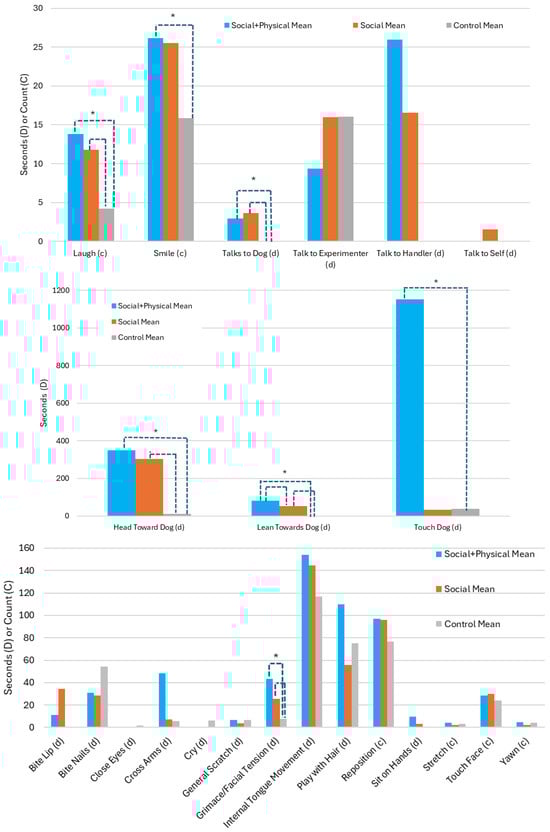 In addition to assessing behaviors across conditions, we also explored correlations between human and dog behaviors. We found some patterns of correlations between potentially stress-linked behaviors, such as participant grimacing and dog circling, participant’s arms crossed and dog barking, participant biting lip and dog jerking/twitching, participant playing with their hair and dog licking the floor or object, human scratching and dog grooming, and human yawning and dog facing away from the person. While some of these behaviors are not always linked to stress, it does suggest that there could be patterns where there are reciprocal stress behaviors. In particular, the co-occurrence of human scratching and dog grooming is an interesting finding that should be explored in future research to see if these patterns are replicated in other circumstances. Counterintuitively, we found few correlations between affiliative behaviors in the social + physical group, where both participant and dog could move freely and choose to interact or not. However, although they were allowed to interact or not, this interaction took place in a very structured experimental setting where the participant was completing various tasks, and therefore there was not as much opportunity for spontaneous interaction as in more naturalistic settings. Together, these findings all suggest the need for further research on the synchronization of dog and human behavior and the conditions under which synchrony takes place, as found with familiar pet dogs []. Research exploring the role of mutual gaze and petting on neural synchrony suggests that there are neural bases to the social interactions between people and dogs [], though there is still much work to be done in identifying the complex mechanisms of social attachment in human–dog dyads []. Furthermore, a fruitful future direction of research would be to assess the timing of these behaviors and in which cases which species might be initiating behaviors. Initiation could be a key component of how a series of stress or affiliative behaviors might unfold.