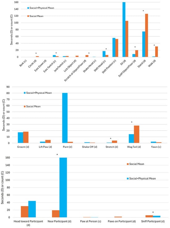 Therapy dogs in the two experimental conditions with live dogs displayed significant differences in the duration or number of times they exhibited 12 behaviors (Table 4, Figure 3). Dogs in the social + physical condition exhibited longer durations or higher counts of the following behaviors: ears twitching (U = 419.5, p = .036), laying down (U = 446.0, p = .010), and shifting their head (U = 499.0, p < .001). Dogs in the social condition displayed longer durations or higher counts of the following behaviors: circling (U = 225.0, p = .019), being near the participant (U = 203.0, p = .031), scratching an object or the floor (U = 225.0, p = .005), sniffing the participant (U = 211.0, p = .046), sniffing an object or the floor (U = 169.0, p = .005), standing (U = 124.0, p < .001), stretching (U = 224.0, p = .026), wagging tail (U = 176.5, p = .005), and walking (U = 20.0, p < .001). There were no other significant differences for dog behavior by experimental group, p > .05.