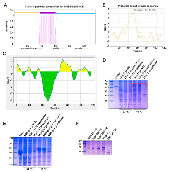 Bioinformatic analysis showed that the ASFV p17 protein is a transmembrane protein, with the transmembrane (TM) region located at 38–60 amino acids (aa) (Figure 1A), which corresponds to the highly hydrophobic region (Figure 1B). Both the extramembrane region (1–37 aa) and intramembrane region (61–117 aa) contain the B cells antigenic epitopes highlighted in yellow color (Figure 1C). Given that the C terminal intramembrane region contains more antigenicity (Figure 1C), this hydrophilic region (61–117 aa) was selected for cloning and fusion expression with soluble tags, E. coli chaperone proteins trigger factor (TF), and maltose binding protein (MBP), respectively. The constructed recombinant prokaryotic expression plasmids, pCold-TF-p17 jd and pCold-MBP-p17 jd, were transformed into DE3/BL21 competent E. coli and cultured at 37 °C or 16 °C with the induction of 1 mM IPTG for 24 h. The soluble expressions of both TF-p17 jd (Figure 1D) and MBP-p17 jd (Figure 1E) were significantly induced by IPTG at 16 °C rather than 37 °C. SDS-PAGE analysis showed that the purified TF-p17 jd and MBP-p17 jd proteins had high purity, and exhibited the molecular weights of approximately 68 kD and 53 kD, respectively, as expected (Figure 1F).