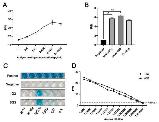 Characterization of anti-p17 mAbs. (A) Optimization of the amount of coating MBP-p17 jd protein in indirect ELISA detecting ASFV positive serum. (B) The mAbs were tested in MBP-p17 indirect ELISA. The supernatants of hybridoma 1G2 and 6G3 were used as the primary antibodies, the SP2/0 supernatant was used as the negative control, and the serum from immunized mice was used as positive control. ** p < 0.01. (C) Subclass of p17 mAbs 1G2 and 6G3 was determined by the monoclonal antibody subclass identification kit (C060101) from CELLWAY-LAB (Luoyang, China). (D) Titer measurement of the ascite mAbs 1G2 and 6G3 using MBP-p17 protein indirect ELISA. The dotted line represents the P/N value of 2.1.