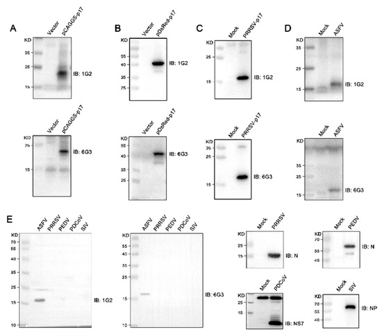 Analysis of the reactivity of p17 mAbs using Western blotting. (A–C) 293T cells were transfected with pCAGGS-p17-HA (1 μg/mL) (A) and pDsRed-p17 (1 μg/mL) (B) with pCAGGS vector and pDsRed vector as the controls. Marc-145 cells were infected with PRRSV-p17 with a multiplicity of infection (MOI) of 0.1 for 72 h (C). Cells were harvested and cell lysates were detected for exogenous p17 using Western blotting with 1G2 and 6G3 mAbs as primary antibodies. (D) Primary PAMs were infected with ASFV (0.1 MOI) or mock-infected for 96 h, and cell lysates were examined for endogenous p17 using Western blotting with the mAbs 1G2 and 6G3 as primary antibodies. (E) Primary PAMs, Marc-145 cells, Vero cells, PK15 cells, and MDCK cells were infected with ASFV (MOI 0.1), PRRSV (MOI 0.1), PEDV (MOI 0.1), PDCoV (MOI 0.1) and SIV (MOI 0.1), respectively. Cells were harvested and cell lysates were detected the specificity of p17 mAbs by Western blotting with 1G2 and 6G3 mAbs as primary antibodies. The replications of PRRSV, PEDV, PDCoV, and SIV were detected using Western blotting with the antibodies indicated. The original images of the Western blot are published as Supplementary Materials.