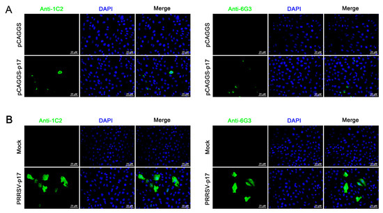 Further tests were conducted to assess the reactivity of the two mAbs with various swine viruses. The results showed that both 1G2 and 6G3 only reacted with AFSV-infected samples, but not other porcine viruses including PRRSV, PEDV, PDCoV, and SIV (Figure 3E). Similarly, immunofluorescence analysis indicated that both mAbs could react specifically with the p17 expressed in transfected 3D4/21 cells (Figure 4A and Figure S1) and in PRRSV-p17-infected Marc-145 cells (Figure 4B), with the detected p17 primarily located in the cytoplasm. These results collectively demonstrated that the produced mAbs are specific to ASFV p17, successfully detecting p17 in various immune assays.