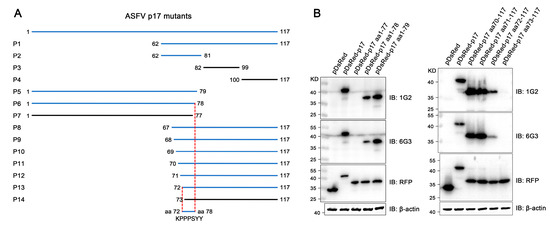 Strategically, the C-terminal intramembrane region of p17 (aa 61–117) was first separated into three fragments which were tested for reactivity with p17 mAbs. Next, based on information on the reacted fragment, progressive truncations at both C terminal ends were performed on full-length p17. The reactivity of different truncated fragments with p17 mAbs was tested, the critical amino acids of both ends for reactivity with p17 mAbs were determined, and the minimal epitope was thus deduced. The template pCAGGS-p17-HA and pDsRed-C1-p17 plasmids were previously constructed and used in this study [11,13]. In total, 14 p17 fragments (P1-P14) were designed, with all cloning PCR primers listed in Table S1. All p17 fragments were amplified by PCR using the template pCAGGS-p17-HA and then cloned into the Bgl II and EcoR I sites of pDsRed-C1-express vector by Seemless/In-Fusion Cloning. All the constructed plasmids were transfected into 293T cells, and the reactivity of different truncated p17 proteins with p17 mAbs was tested using Western blotting.