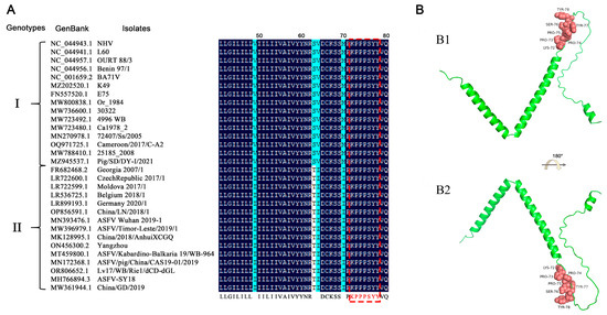 Conservation of the identified novel linear epitope of the p17 protein. (A) Alignment of the epitope (72KPPPSYY78) of 30 representative genotypes I and II ASFV strains. The red box indicated the identified epitope. (B) Prediction of the p17 structure using Alphafold2 online web tools and visualization with PyMOL. The epitope of the two mAbs is displayed in pink color and shown in the front view (B1) and in flipping 180° along the x-axis (B2), respectively.