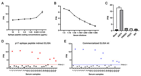 Establishment of epitope-based indirect ELISA to detect ASFV antibodies. (A) The p17 epitope peptide (synthesized by GeneCreate Wuhan, China) was used for coating at concentrations from 0.3125–10 μg/mL. The epitope ELISA was used for detection of ASFV-positive serum (1:5 dilution) and negative normal pig serum to determine the optimized concentration of coating epitope peptide. (B) Optimization of serum dilution with peptide coating concentration at 0.3125 μg/mL. (C) The specificity of the established epitope ELISA. PRRSV, PEDV, SIV, and ASFV positive pig sera and negative pig serum were used. ** p < 0.01. (D,E) 24 clinical pig sera were tested with our established indirect epitope peptide ELISA (D) and the commercial ASFV ELISA detection kit (E), with pig-negative serum as the control. The samples marked in red (D) and blue (E) are those with positive detection results.