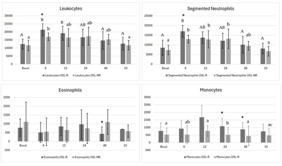 Mean values of total leukocytes, segmented neutrophils, eosinophils, and monocytes in bitches undergoing ovariohysterectomy via celiotomy with ovarian suspensory ligament rupture (OSL-R) and without rupture (OSL-NR). Asterisks (*) indicate statistically significant differences between groups (p < 0.05). Uppercase different letters represent differences across time points within the OSL-R group, while lowercase different letters represent differences across time points within the OSL-NR group.