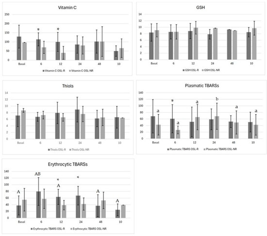 Regarding oxidative metabolism, the vitamin C levels differed between groups at 6 h (p = 0.02; OSL-R = 114 ± 35.8, OSL-NR = 70.1 ± 33.7) and at 12 h (p = 0.01; OSL-R = 100 ± 52.2, OSL-NR = 40.3 ± 35.4) (Figure 2). No temporal variations were observed within either group. Both the GSH and P-SH levels showed no significant differences between groups or over time (Figure 2). The plasma TBARS levels differed between groups at 6 h, being lower in the OSL-NR group (p = 0.03; OSL-R = 60.8 ± 43.0, OSL-NR = 26.6 ± 11.9) (Figure 2), with the OSL-NR group showing temporal variation (p = 0.04), peaking at 24 h and returning to baseline by 48 h. Erythrocyte TBARSs also differed between groups at 12 h (p = 0.01; OSL-R = 63.4 ± 22.7, OSL-NR = 38.8 ± 14.4) and at 24 h (p = 0.03; OSL-R = 67.2 ± 28, OSL-NR = 42.2 ± 18.5) (Figure 2). In the OSL-R group, erythrocyte TBARSs increased at 6 h and returned to baseline by 12 h (p = 0.007) (Figure 2).