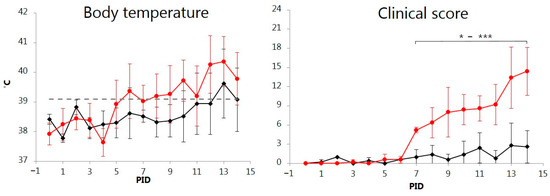 Development of body temperature (measured by subcutaneous microchip transponder) and clinical scores for pigs orally (ORAL group; ◆) or intranasally (NASAL group; ●) inoculated with the classical swine fever virus strain Paderborn. Each point represents the mean ± SD of 5 piglets. Temperatures above the grey dashed horizontal line at 39.1 °C correspond to fever. PID = post-inoculation day. Significant different (p < 0.05 to p < 0.001) means between groups are marked by * to ***.