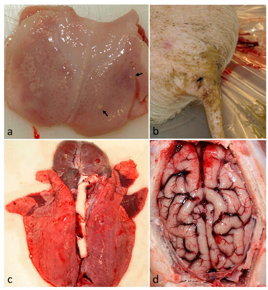 Gross pathology pictures of pig No. 8 inoculated intranasally with classical swine fever strain Paderborn. (a) Tonsil with bluish discoloration, erythema, and pustules (arrows). (b) Tail and hindquarter soiled with watery, greenish feces consistent with diarrhea. (c) Lung with lobular bronchopneumonia in the cranioventral lung lobes. (d) Brain with meningeal hyperemia and hemorrhage.
