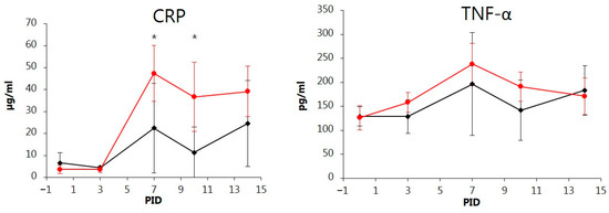 The TNF-α pre-inoculation values were below 155 pg/mL for individual pigs in both groups (Figure 4 and Supplementary Figure S1). On PID 7, mean TNF-α levels had increased in both groups to about 1.5–2 times that of the pre-inoculation values, but with marked individual differences ranging from 114 to 339 pg/mL in the ORAL and 218 to 315 pg/mL in the NASAL group. The mean levels then dropped in both groups, but among the orally inoculated pigs, there was a second slight increase on PID 14, corresponding to an increase in CRP for this group. The recorded fluctuation in the mean values of TNF-α among the orally inoculated pigs with a second peak on PID 14 was caused by de novo infection of pig No. 5 and a second increase of TNF-α levels in pig No. 2, which experienced clinical deterioration (increased clinical score) on PID 13 and 14. However, the mean TNF-α levels did not differ significantly between the two groups at any time.