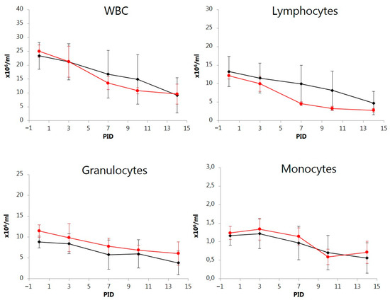 In both groups, the mean total WBC counts gradually decreased over time from 23.4 to 25.0 × 106/mL on PID 0 in the ORAL and NASAL groups, respectively (Figure 5), to levels significantly lower on PID 14 in the ORAL group (p < 0.0001) and on PID 7, 10, and 14 in the NASAL group (p < 0.01–p < 0.001). On PID 14, all virus-positive pigs had reduced levels of WBC to approximately 10 × 106/mL. The kinetics of the change in total WBC counts were paralleled by decreased lymphocyte counts on PID 14 in the ORAL group (p < 0.01) and on PID 7, 10, and 14 in the NASAL group (p < 0.0001) compared to PID 0 (Figure 5). While granulocyte counts gradually decreased for both groups, significant reductions were found in the NASAL group on PID 7, 10, and 14 (p < 0.05–p < 0.01), but not in the ORAL group (Figure 5). However, the relative distribution between lymphocytes and granulocytes changed significantly in the NASAL group toward higher mean percentages of granulocytes on PID 7, 10, and 14 (p < 0.01, p < 0.001, p < 0.01) compared to PID 0. The monocyte counts had decreased in the ORAL group on PID 14 (p < 0.05) and in the NASAL group on PID 10 and 14 (p < 0.01 and p < 0.05) (Figure 5). Generally, the decreased cell counts were most pronounced in the NASAL group. However, the differences in the mean values for the total WBC, the lymphocytes, the monocytes, and the granulocytes were not statistically significant between the two groups at any time, reflecting the blurring effect of the pigs in the ORAL group that were not directly infected after inoculation.