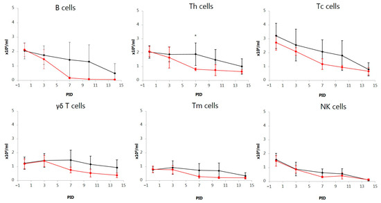 Variations over time in absolute numbers of B cells and T cell sub-populations (T helper (Th) cells; cytotoxic T (Tc) cells; γδ T cells; memory Th (Tm) cells; natural killer (NK) cells) of pigs orally (ORAL group; ◆) or intranasally (NASAL group; ●) inoculated with the classical swine fever virus strain Paderborn. Each point represents the mean ± SD of 5 piglets. PID = post-inoculation day. Significant different (p < 0.05) means between groups are marked by *.