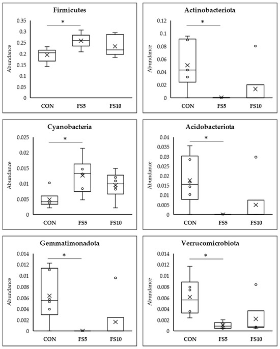 Top 12 bacterial phyla present in the cecum of broilers fed with different dietary fenugreek concentrations; n = 6/group. Abbreviations: CON = basal diet; FS5 = CON with 5 g/kg fenugreek seeds; FS10 = CON with 10 g/kg fenugreek seeds. Circle represents the data points and ‘X’ represents the mean value for each treatment group. Asterisk (*) represents significant variation between the treatment groups (p < 0.05).