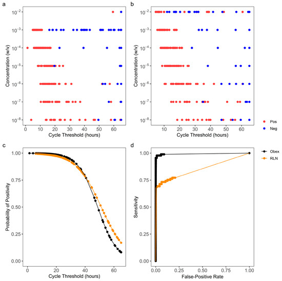 Obex and RLN tissue specimens with known CWD statuses were serially diluted to simulate specimens containing various concentrations of PrPCWD. At 10−2 w/v, the obex tissue homogenate inhibited the RT-QuIC reactions and prevented the production of cycle thresholds based on the Tstdev within the 65 h assay (Figure 1a). For RLN, at 10−2 w/v, non-specific amyloid formation occurred as early as 12 h (Figure 1b). From 10−4 to 10−8 w/v for obex and 10−3 to 10−8 w/v for RLN, the cycle thresholds for the CWD+ tissue homogenates occurred earlier than those for the CWD− homogenates (Figure 1a,b). At 10−9 w/v and lower, the cycle thresholds of most reactions seeded with either the CWD+ or CWD− homogenates were close to 65 h, suggesting an analytical sensitivity or limit of detection of CWD in obex and RLN tissue specimens at 10−8 for both tissues. Thus, a global ROC curve, including dilutions from 10−4 to 10−8 w/v and from 10−3 to 10−8 w/v, was constructed for obex and RLN, respectively (Figure 1c,d). The observed AUCs were 0.933 and 0.890 for obex and RLN, respectively (Figure 1d), indicating that cycle threshold has a very strong classifying power for both types of tissues. Based on these ROC curves, the optimal assay duration time was 33 h for obex and 30 h for RLN, respectively.