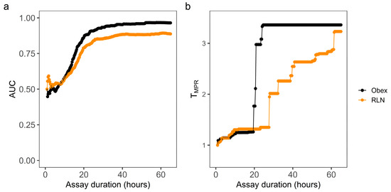 The same ThT data from the above RT-QuIC reactions were used to calculate MPR values for each reaction along with the increasing assay durations. The MPR values for the CWD+ obex or RLN tissue homogenates at 10−2 w/v were indistinguishable from those for the CWD− tissue homogenates at various assay durations (Figures S1a–c and S2a–c), reflecting the inhibited or non-specific amyloid formations as described above. Thus, the MPR values at this concentration were not used for the determination of the optimal assay duration. For obex from 10−4 to 10−8 w/v and RLN from 10−3 to 10−8 w/v, the MPR values from the reactions seeded with the CWD+ homogenates became greater than those with the CWD− homogenates at assay durations of 28 and 46 h (Figures S1b,c and S2b,c). As such, RFU data generated from these concentrations were used to construct the MPR distributions and global ROC curves. Based on the MPR distribution corresponding to each increasing assay cycle from the 4th to 224th cycle, 221 ROC curves were constructed for the obex or RLN tissue homogenates. These ROC curves indicated that MPR has very strong classifying power when the assay duration is 28 h or longer. Such findings were confirmed by plotting the AUC values of the 221 ROC curves against the corresponding assay durations for obex or RLN (Figure 2a). However, the classifying power of MPR plateaus after around 30 h. Thus, the optimal assay durations were defined as the point at which the dAUC/dT stopped increasing (Figure S3). As such, an assay duration of 102 cycles (29 h) for obex and 110 cycles (32 h) for RLN were considered optimal for the detection of CWD with MPR. Based on the individual ROC curves, an accumulated MPR threshold (TMPR) was determined and plotted against assay duration (Figure 2b). The TMPR corresponding to the optimal assay duration was 3.36 and 2.00 for obex and RLN, respectively. At the pre-determined assay duration of 40 h, the ideal TMPR was 3.36 and 2.54 for obex and RLN, respectively.