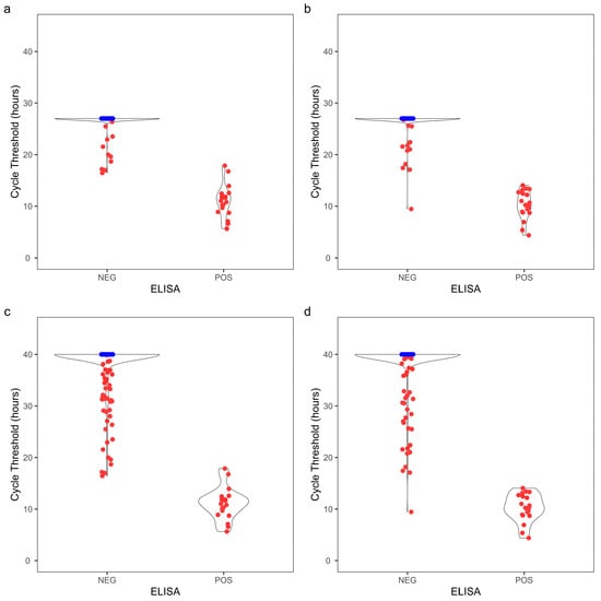 Cycle threshold distributions of 104 obex and RLN white-tailed deer samples from a CWD-affected farm. Ct values from quadruplicate reactions from 104 samples were determined at 33 h with obex (a), 30 h with RLN (b), 40 h with obex (c), and 40 h with RLN (d). Replicates that did not surpass Tstdev within the assay duration were assigned a Ct of 33 h (a), 30 h (b), or 40 h (c,d). Replicates in red surpassed Tstdev within the assay duration, whereas replicates in blue did not surpass Tstdev.
